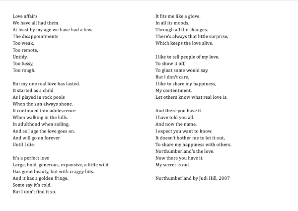 Based on a poem "Northumberland" written by Judi Hill in 2007 the stone was commissioned by Judi's children after her death in 2019 and created by stone sculptor Luke Batchelor. The stone sits on Bracken Hill, overlooking the Northumbrian coastal village of Alnmouth. OS Grid Ref NU 24949 10941.